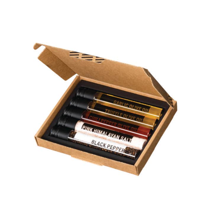 De inhoud van deze kookbox is met zorg samengesteld. De Liquido d'Oro oliën worden geleverd in handige rPET tubes, perfect gedoseerd voor gebruik in de keuken. De combinatie van Himalaya zout, zwarte peper en de drie smaakvolle oliën (truffel, chilipeper en knoflook) biedt eindeloze mogelijkheden om gerechten naar een hoger niveau te tillen. Een geschenk waar kookliefhebbers écht blij van worden.